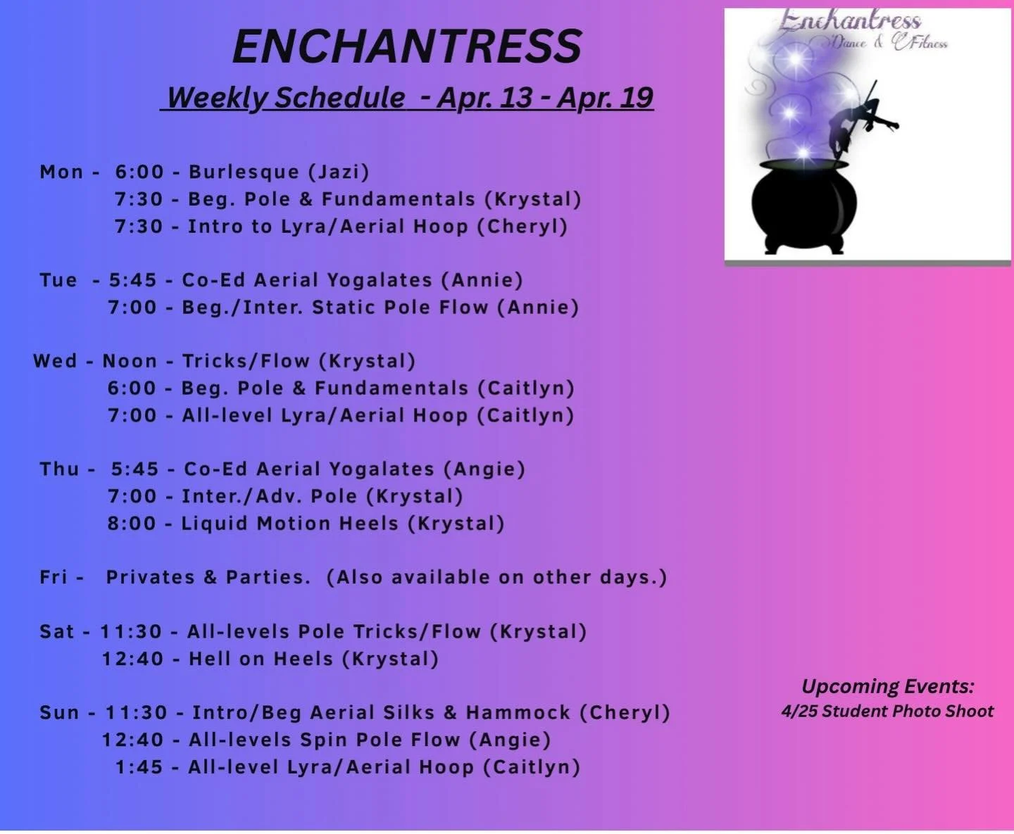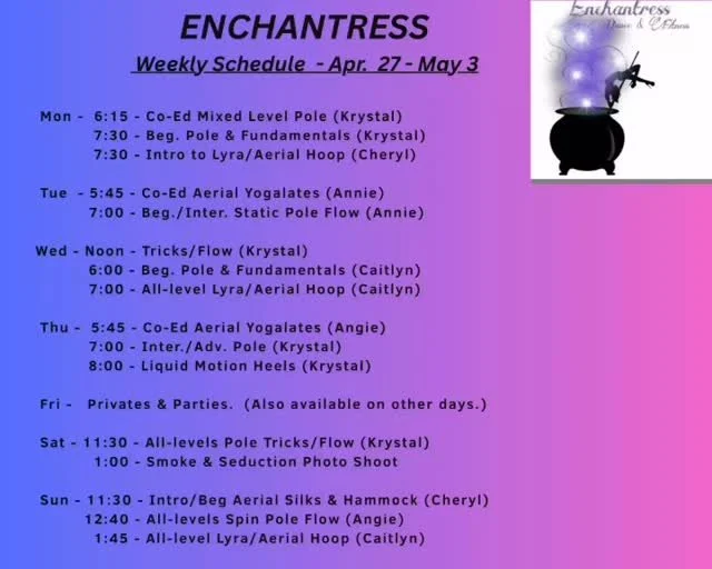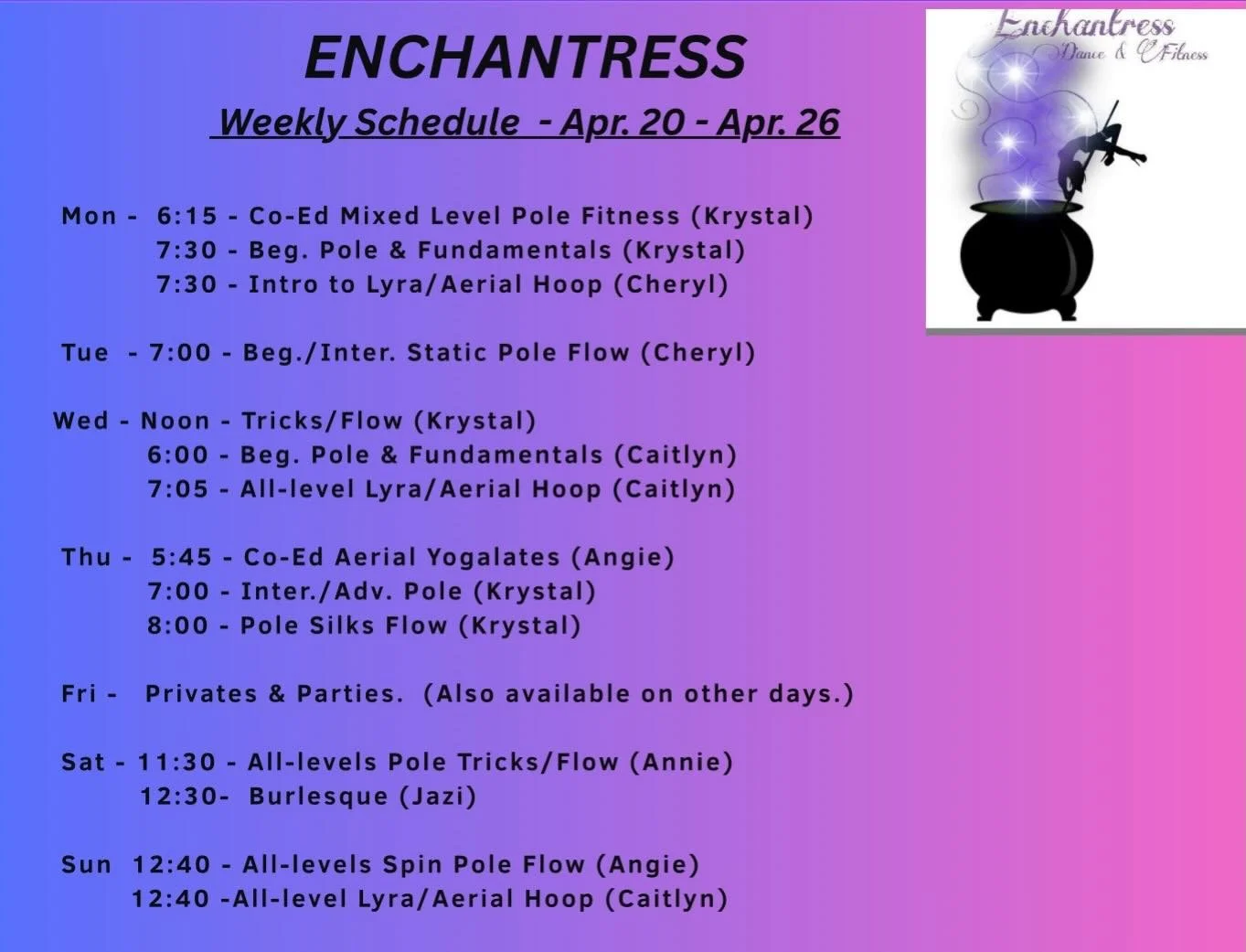 At Enchantress, we’re passionate about helping you feel strong, confident, and truly empowered. Whether you're a first-timer exploring pole dancing or a seasoned aerialist looking for your next challenge, our studio just outside of New Orleans (NOLA) is the perfect space to unleash your inner goddess. We offer fun-filled classes in pole dancing, pole silks, aerial hoop (lyra), floor work, and other unique themed sessions. Every visit here is an adventure! With both in-studio and virtual options, you can join us no matter where you are. Come as you are, connect with an amazing community of women, and let’s dance together—we can’t wait to see you shine!